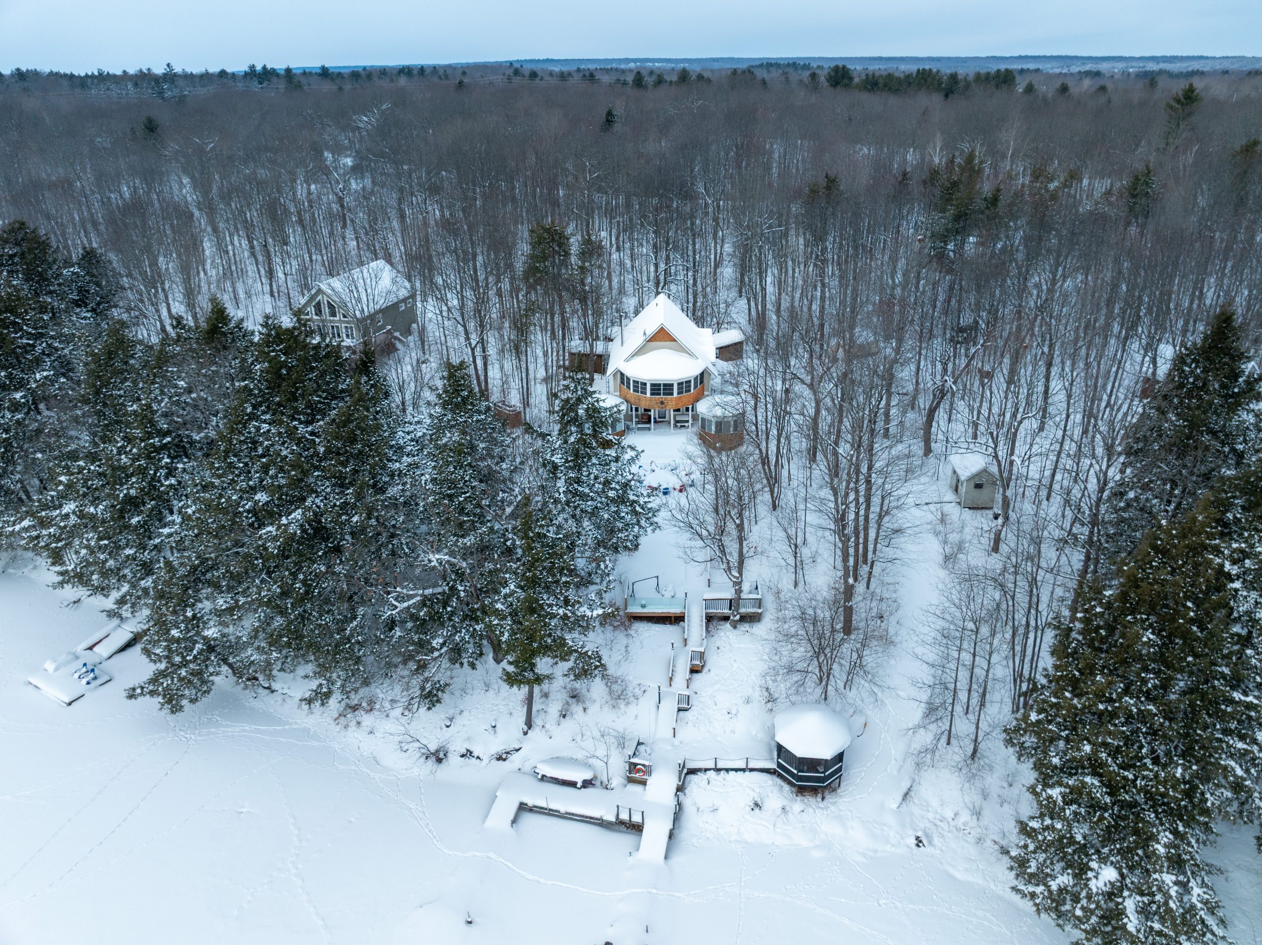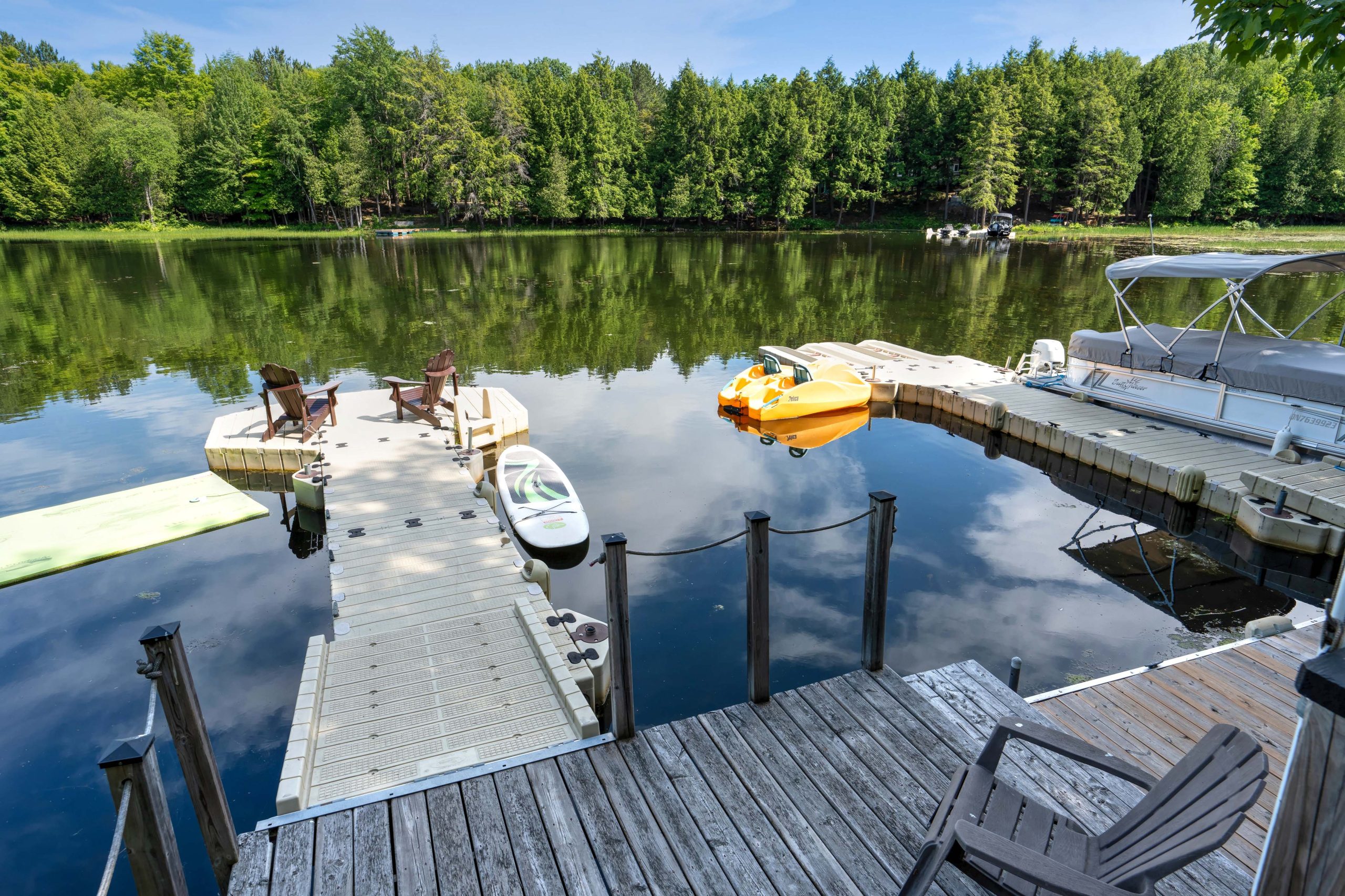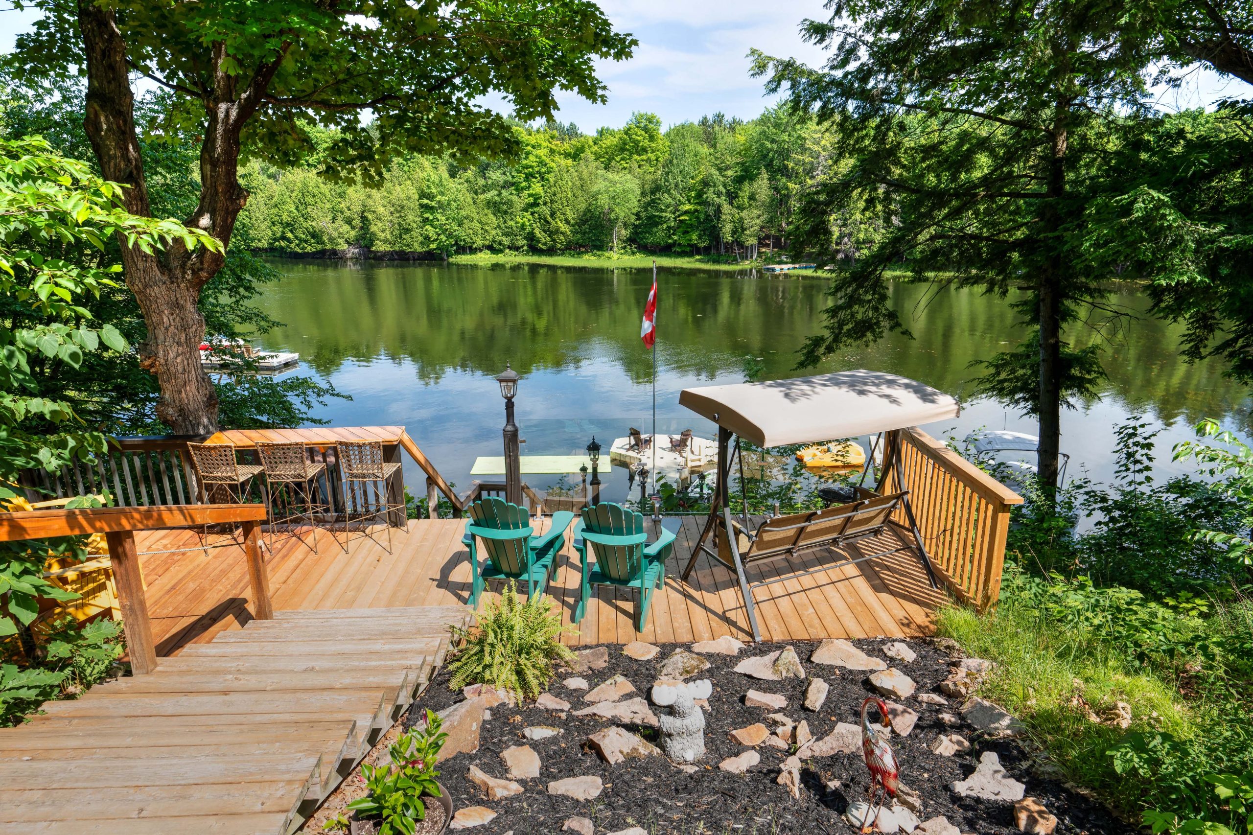 Welcome to 133 Swan Lane on Big Rideau Lake, a spacious year-round waterfront retreat designed for gathering, hosting, and making memories. This 6-bedroom, 2-bath home offers room for everyone, with an open-concept kitchen and living area, plus a main-floor bedroom and full bath. Upstairs features 3 additional bedrooms and a full bathroom, including a generous primary suite with its own enclosed porch overlooking the lake. The fully finished basement adds a large rec room and 2 more bedrooms – perfect for guests or extended family. Set on a beautiful 1.5-acre lot with 150 feet of waterfrontage, the property truly shines outdoors. 4 insulated bunkies, each with heat and A/C, provide exceptional guest accommodations, with three set up for sleeping and a fourth converted into a bathroom. Enjoy time on the water from the U-shaped dock, relax in one of the gazebos, or take in the views from the expansive decking. A large 24′ x 40′ detached garage offers plenty of storage for toys and tools. Located on a quiet bay off a private road, this property offers privacy, space, and the ultimate Big Rideau Lake lifestyle. Recent updates include a new roof and deep well pump (2022). A rare opportunity to own a versatile waterfront property with room for the whole crew.